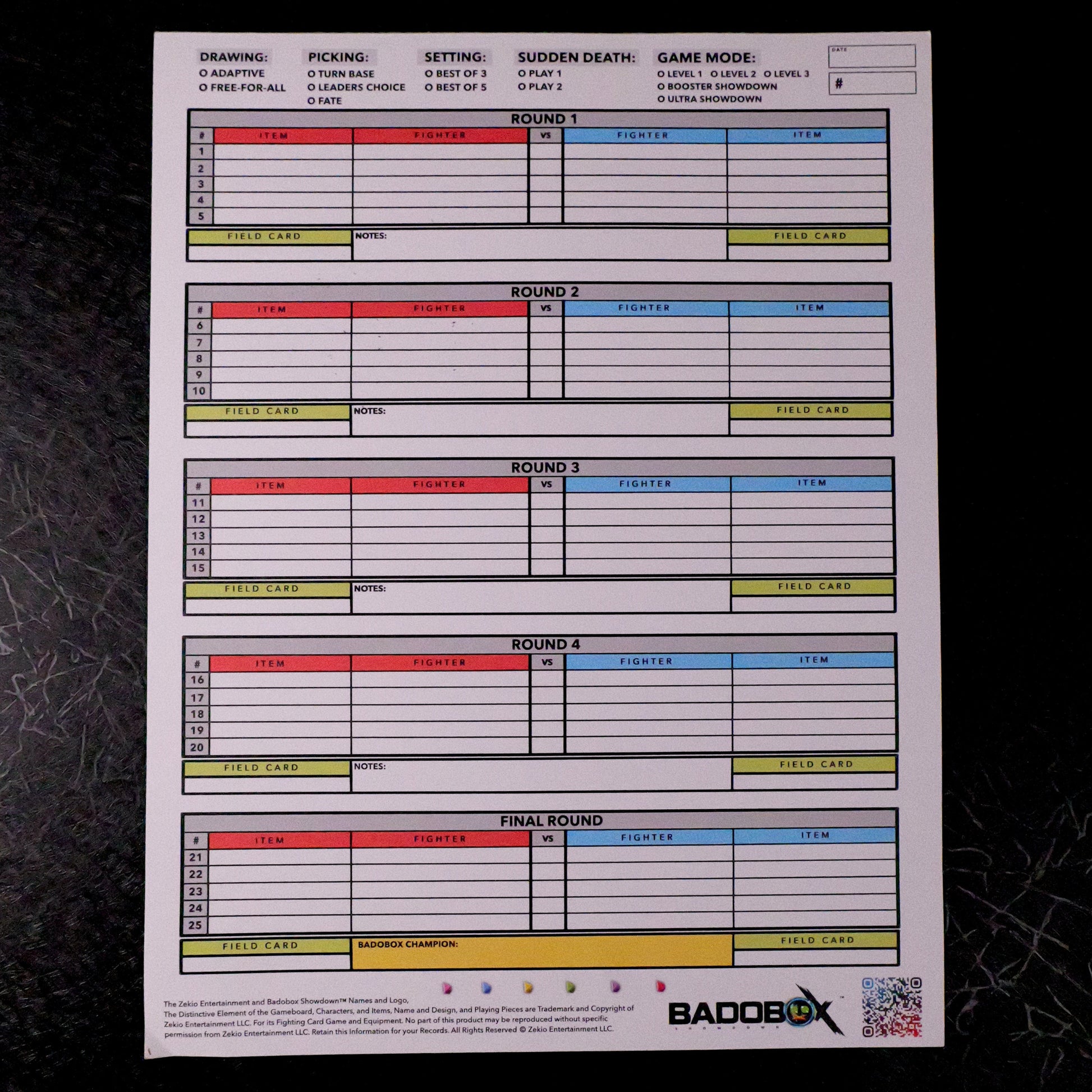 Keep track of your fights, game modes and play dates with our official scorebook for your Badobox Showdown™ Card Game.